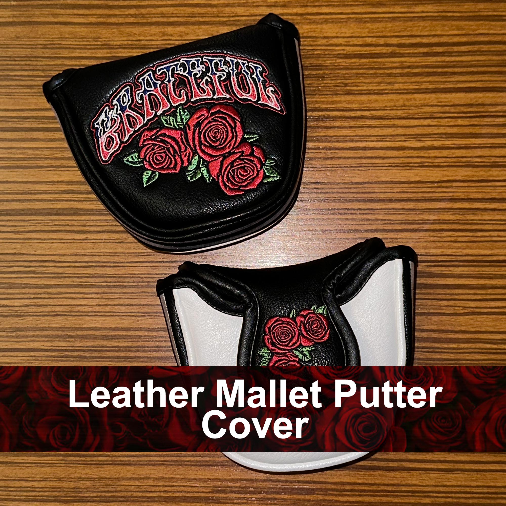 Our Phunky Threads retro style “Grateful” putter cover is leather and has a vintage throwback style design, made to fit most putters. They are water resistant and constructed with a velvet lining, leather stripes and embroidered “Grateful” and roses. 5.91″ x 4.72″ x 1.38″. Magnet Closure.